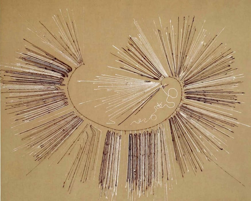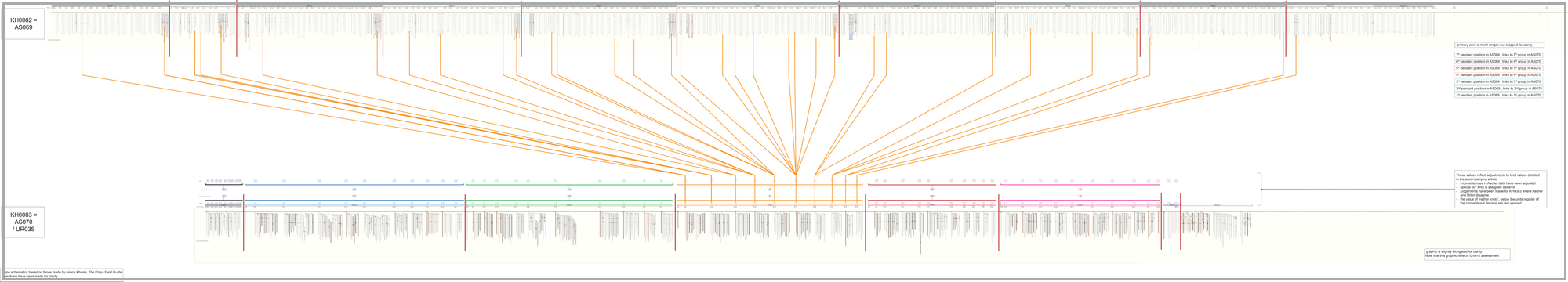 Aunque me encantan los números, realmente necesito visualizar su relación. Hice el siguiente diagrama como una representación visual de las conexiones para la posición/grupo 4 (es necesariamente muy detallado porque hay muchos cordones). En la parte superior del gráfico está el esquema KFG para KH0082, y en la parte inferior está KH0083. Los cordones marcadores rojos/blancos para cada khipu están representados por líneas verticales rojas que superponen los esquemas, dividiendo cada khipu en partes. Las líneas naranjas conectan los cordones anudados en KH0082 (para mayor claridad, los cordones en blanco no están marcados) con su cordón compañero correspondiente en KH0083. Por ejemplo, cada cordón anudado en la cuarta posición en su grupo en la parte 1 en KH0082 (hay dos) se conecta con el cordón 1 y sus subsidiarios en la parte/grupo 4 en KH0083.