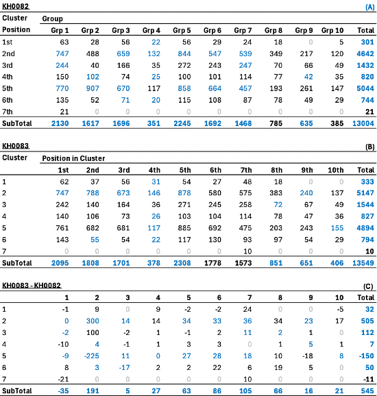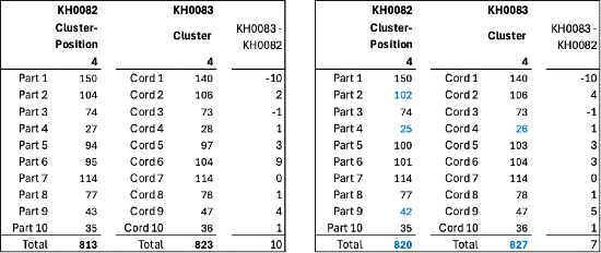 Cuando miro el primer cordón de cada grupo en KH0082 (esto es lo que llamo posición de grupo 1) y sumo los valores de esos cordones, obtengo 303. Cuando sumo los valores del primer grupo en KH0083, obtengo 335; es cercano pero no exacto.